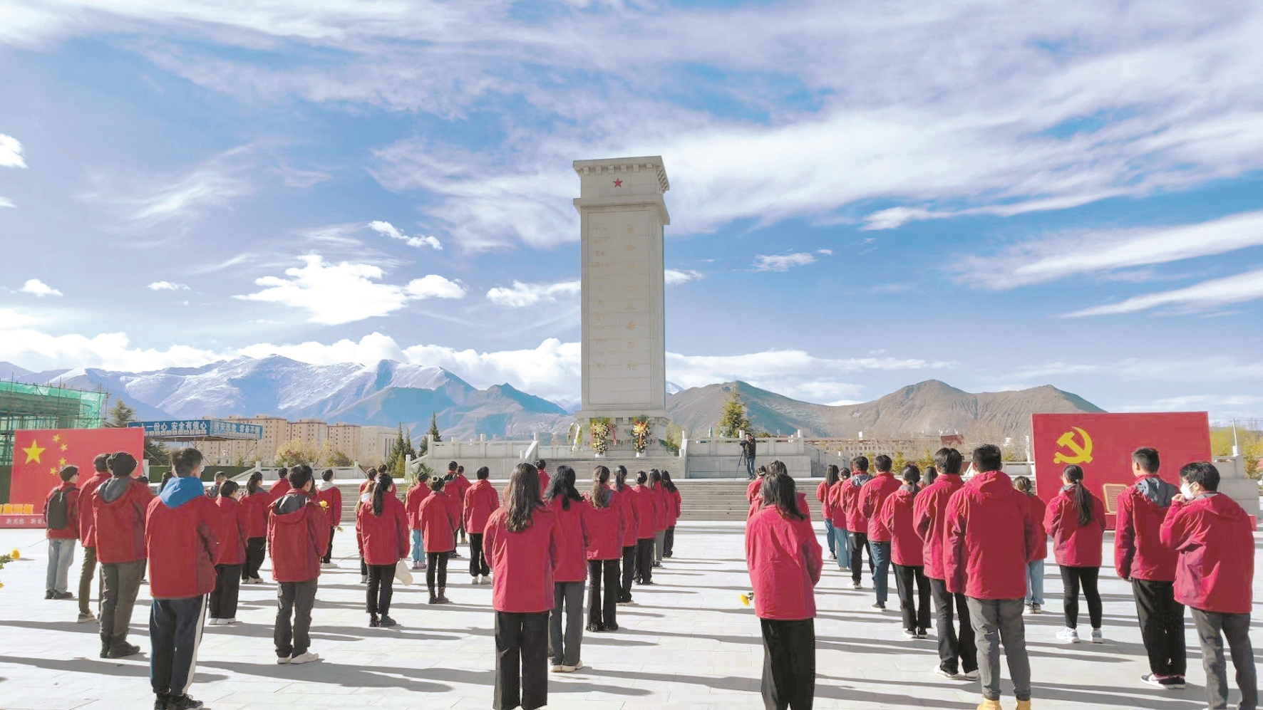 鮮花寄哀思,傳承慰英魂?;顒蝇F(xiàn)場,90余名“西部計劃”西藏專項志愿者身著紅色志愿服,手持黃色菊花,向革命先烈集體默哀,并瞻仰革命烈士紀念碑向革命先烈敬獻花籃,表達對革命先烈的無限崇敬之情和深情哀思。
