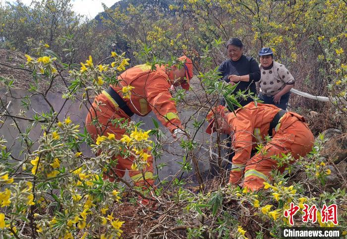 森林消防隊(duì)員正在為前來祭祀的民眾普及防火知識?!∥骼@拉翁 攝
