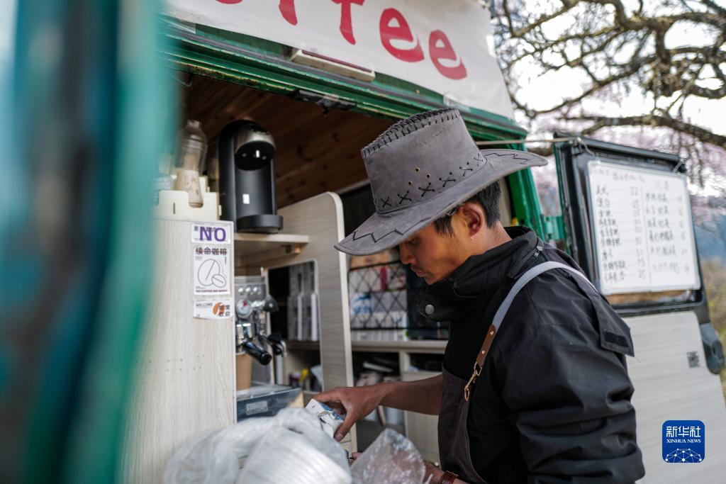 牟宜平和譚艷的咖啡車停在桃花谷中(2023年3月24日攝)。新華社記者 洛卓嘉措 攝