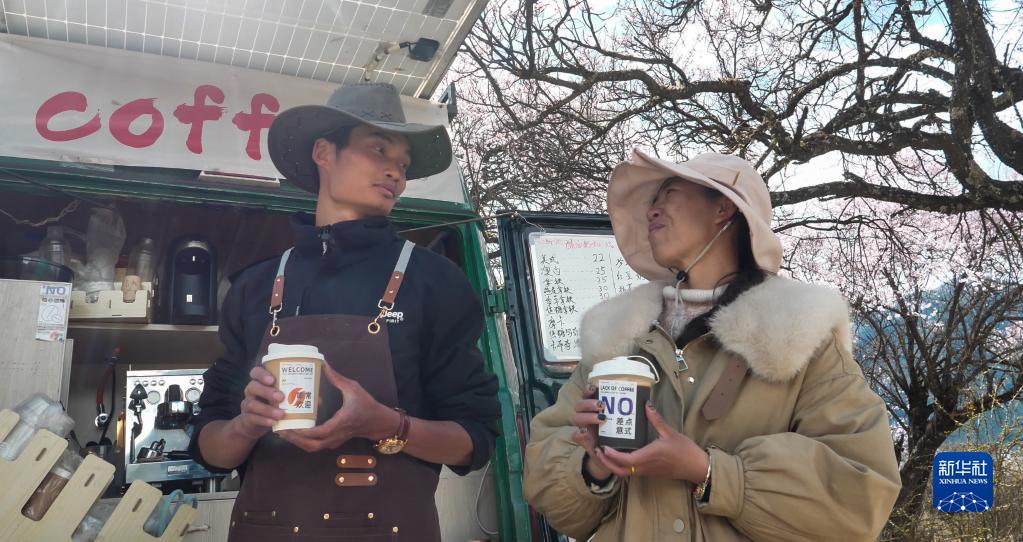 桃花谷中,咖啡車停在桃樹下,車后遠處是連綿的雪山。樹上的桃花被風(fēng)吹落,一朵花瓣剛巧落在還未來得及封蓋的咖啡里,但顧客對此并不在意,“這才有林芝春天的感覺!”他說。