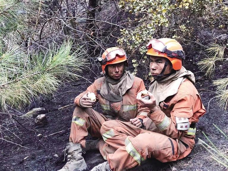 參與滅火任務(wù)后正在休息的陳子明(右)。圖片由林芝市森林消防支隊提供