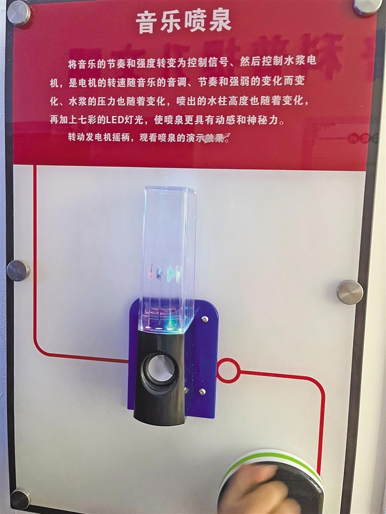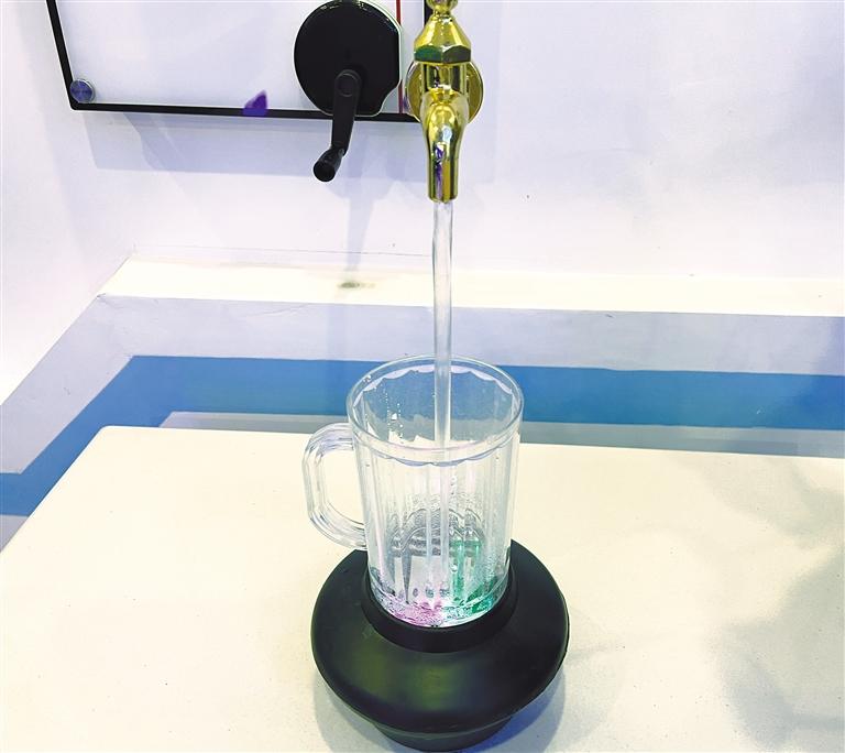 “這個(gè)體驗(yàn)項(xiàng)目叫‘天上來水’。設(shè)計(jì)者巧妙設(shè)計(jì)水流通過水泵及透明玻璃管壓入水龍頭內(nèi),在封閉的水龍頭出口處將水溢出管口,溢出的水又將玻璃管隱蔽,水流的循環(huán)造成觀眾難以發(fā)現(xiàn)特殊裝置的奧秘,從而形成人為制造的錯(cuò)覺?!斌w驗(yàn)結(jié)束后,索央向小朋友解釋“天上來水”的科學(xué)原理。