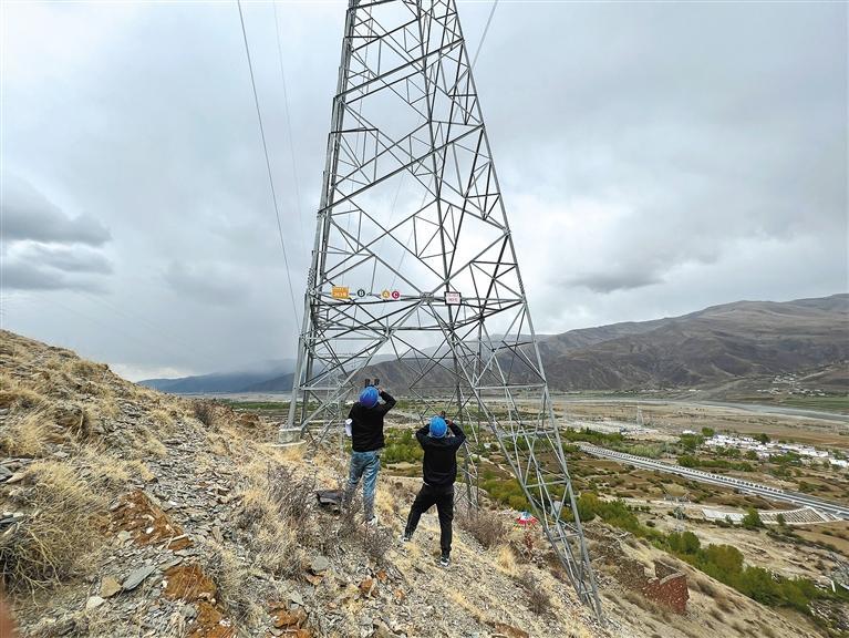 4月30日上午,國(guó)網(wǎng)日喀則供電公司輸電運(yùn)檢中心工作人員在巡檢線(xiàn)路。袁海霞 鄭璐 攝