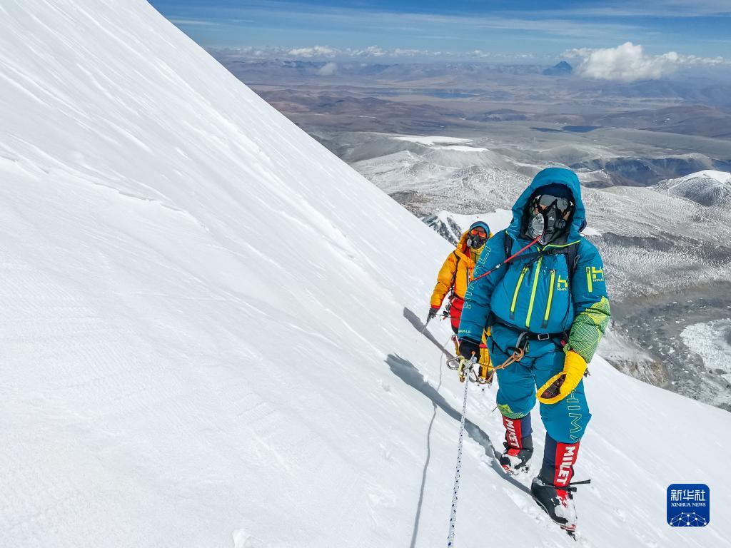 董紅娟(左)在登頂希夏邦馬峰后下撤(4月26日攝)。新華社 頓巴 攝