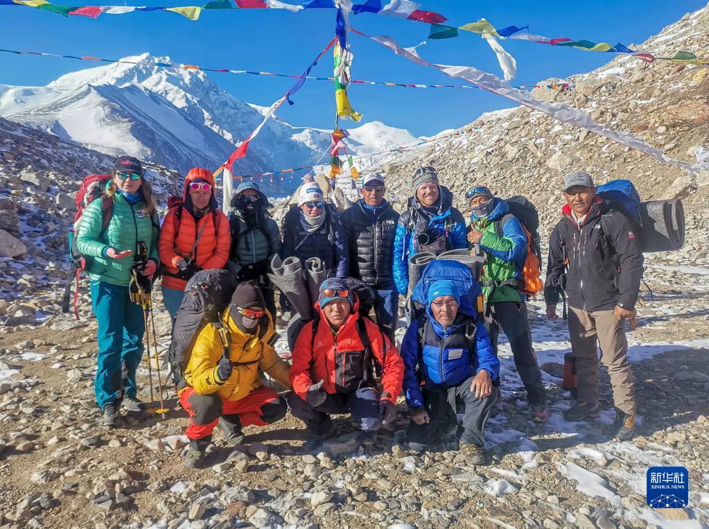 董紅娟(后排左三)在開(kāi)始攀登希夏邦馬峰前與隊(duì)友合影留念(4月23日攝)。新華社 頓巴 攝
