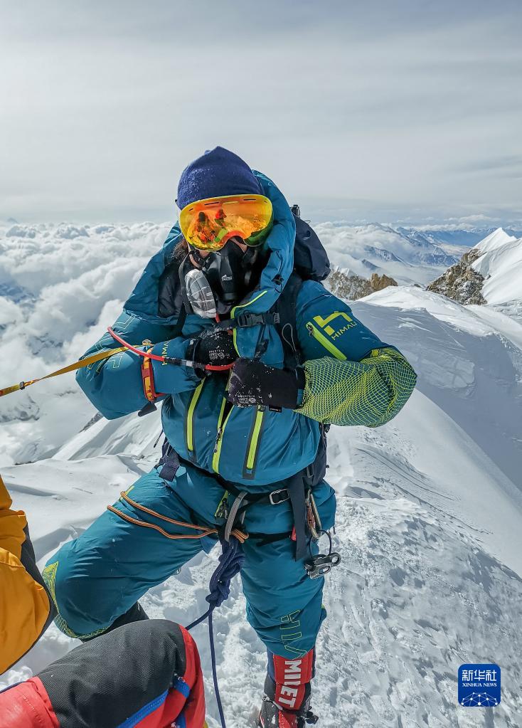 董紅娟在海拔8027米的希夏邦馬峰頂(4月26日攝)。新華社 頓巴 攝