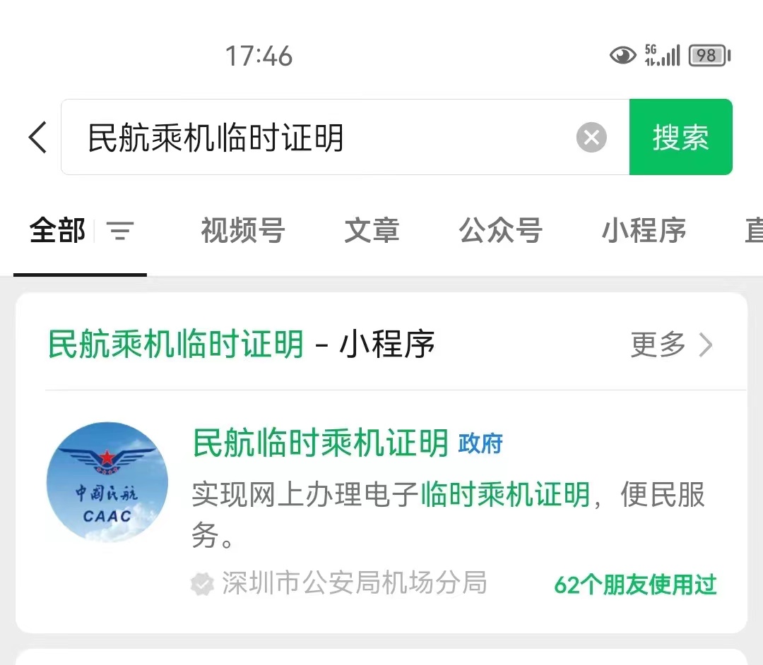 3、請(qǐng)您出示與購(gòu)票時(shí)一致的有效證件辦理乘機(jī)手續(xù),以免因證件不符耽誤行程。如身份證過期或丟失,您可以在微信小程序和支付寶頁(yè)面搜索“民航臨時(shí)乘機(jī)證明”小程序進(jìn)行辦理。