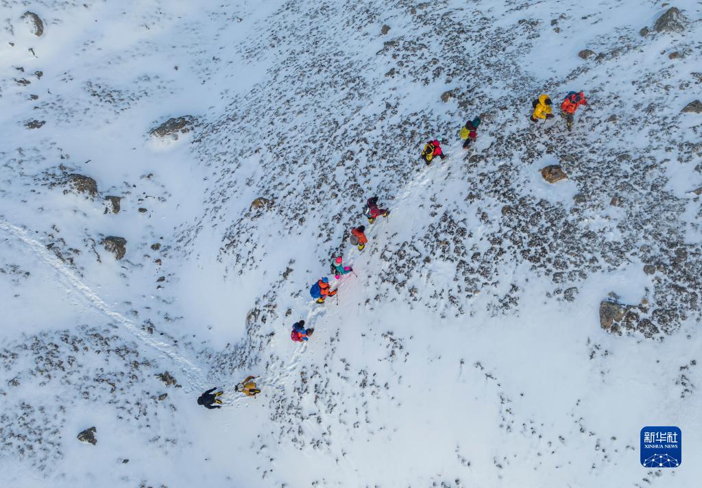 5月3日,登山愛好者正在攀登海拔6010米的洛堆峰(無人機(jī)照片)。新華社記者 孫非 攝