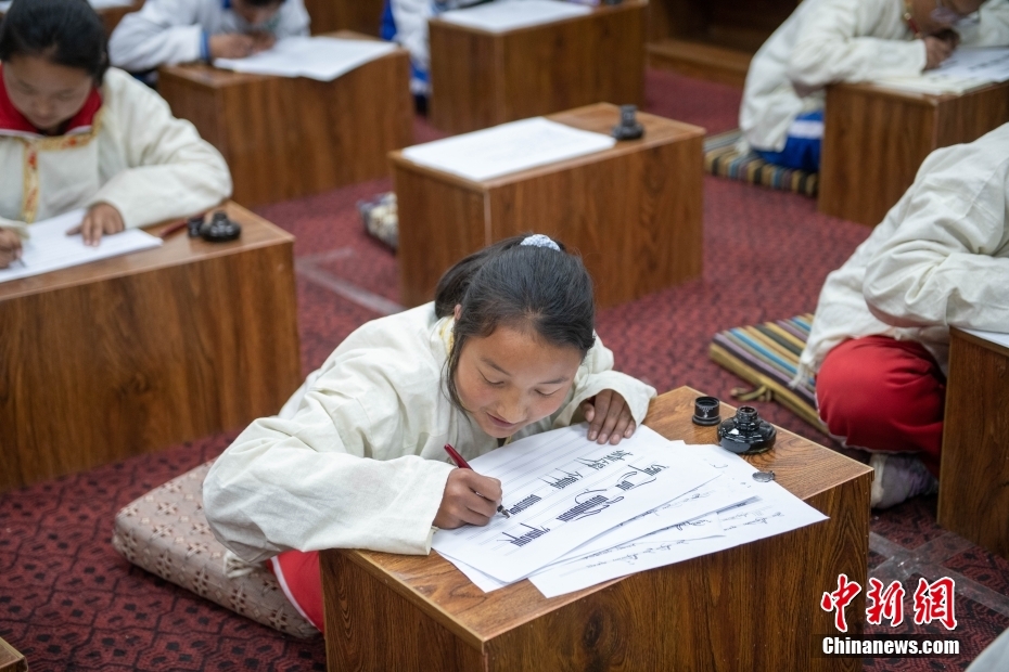 5月7日,西藏山南市,加查縣中學(xué)學(xué)生和教師在上藏文書法興趣班。該興趣班由2名藏文教師任教,每周兩課時(shí),利用自習(xí)課或晚自習(xí)時(shí)間為學(xué)生和教師授課。課程內(nèi)容包含執(zhí)筆、運(yùn)筆、姿勢(shì)等基礎(chǔ)書寫技能,以及藏文中的烏金體、珠擦體、簇仁體、簇通體等各類字體的書寫方法。