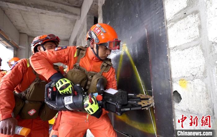 圖為演練中指戰(zhàn)員在電梯井進(jìn)行破拆。西繞拉翁 攝