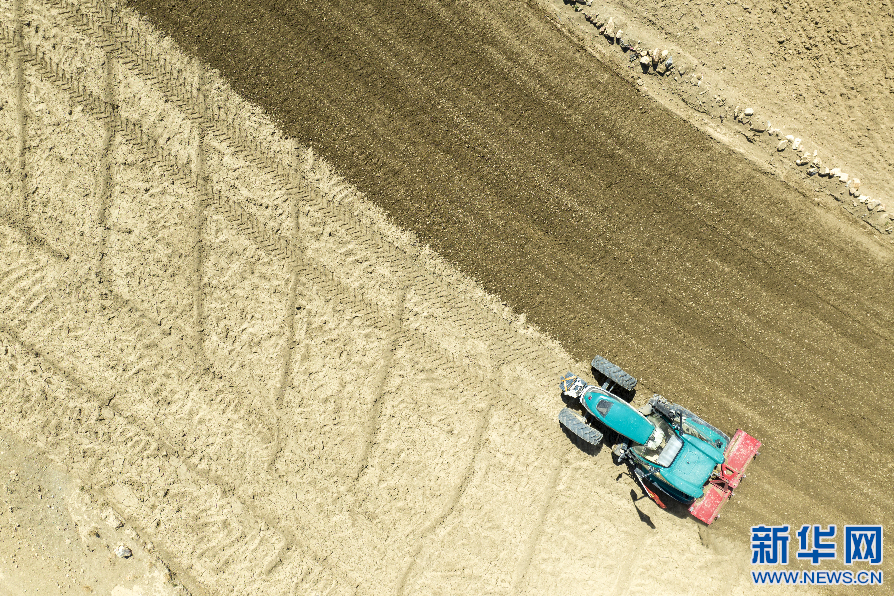 5月12日,西藏定日縣扎西宗鄉(xiāng)巴松村的村民在犁地(無人機(jī)照片)。 新華網(wǎng) 旦增努布 攝