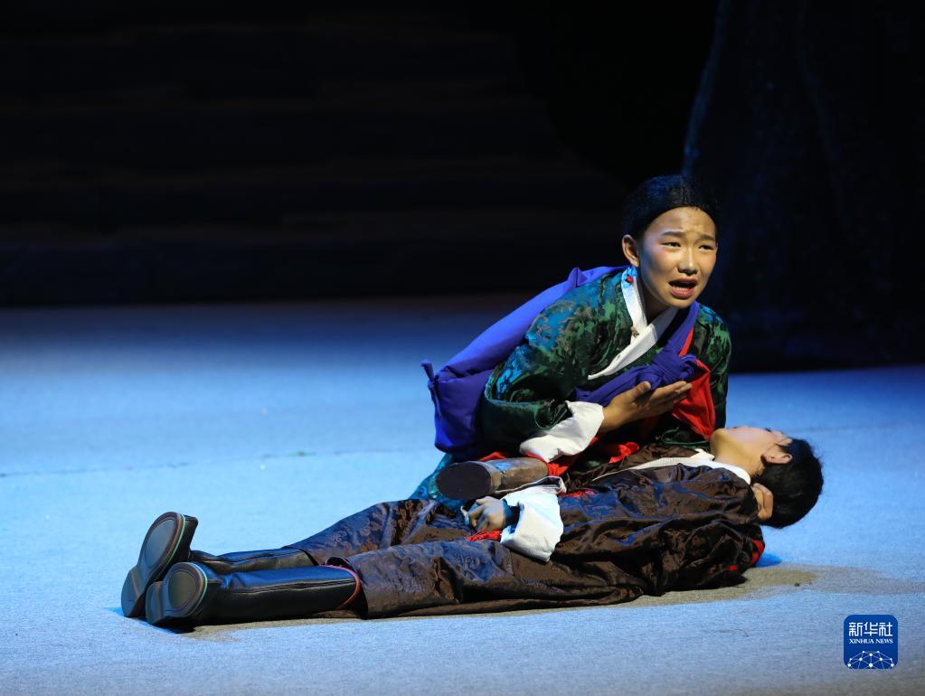 13歲的小演員旦增夢朗身著深綠色藏戲服飾,跪在舞臺中央,眼角噙淚,緊摟著失去意識的弟弟……低沉、哀慟的藏戲唱腔,舞臺兩側(cè)實(shí)時(shí)滾動(dòng)的字幕,看哭了不少觀看試演的觀眾。