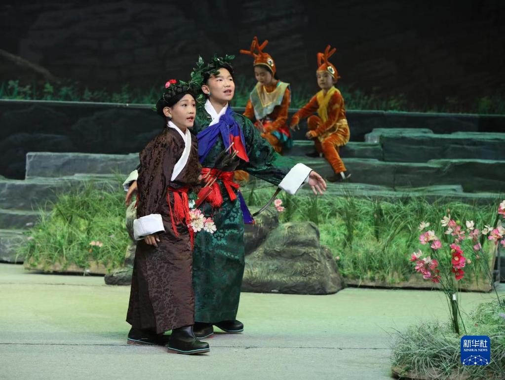 藏戲小演員在舞臺上表演少兒舞臺劇藏戲《頓月頓珠》。
