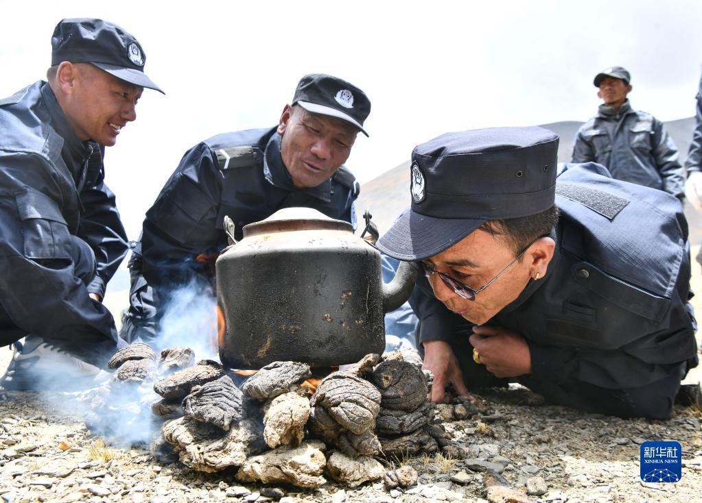 護(hù)邊聯(lián)防隊(duì)隊(duì)員在一塊空地上點(diǎn)燃牛糞,準(zhǔn)備午餐(6月2日攝)。新華社記者 晉美多吉 攝