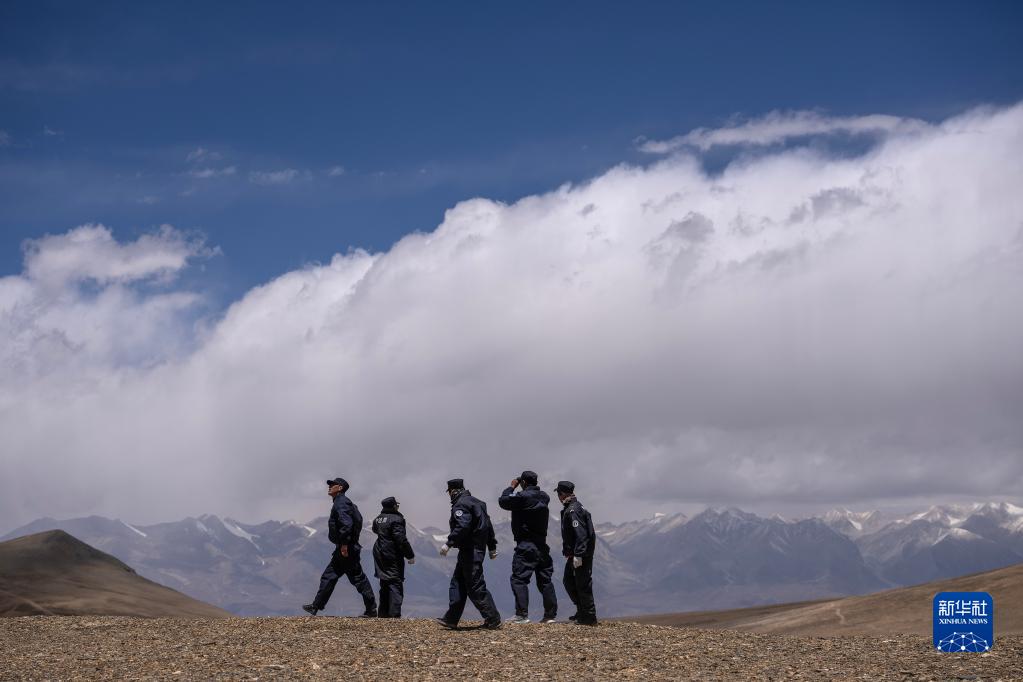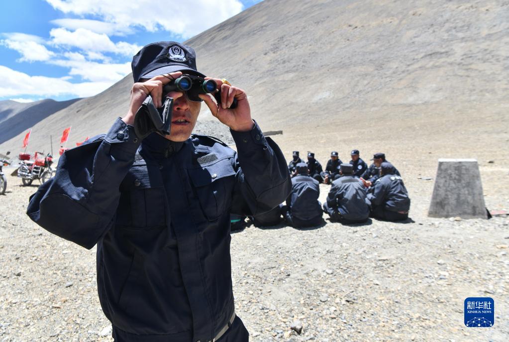 6月2日,在33號(hào)界樁處,護(hù)邊聯(lián)防隊(duì)隊(duì)員列隊(duì)準(zhǔn)備分頭巡邏。新華社記者 晉美多吉 攝