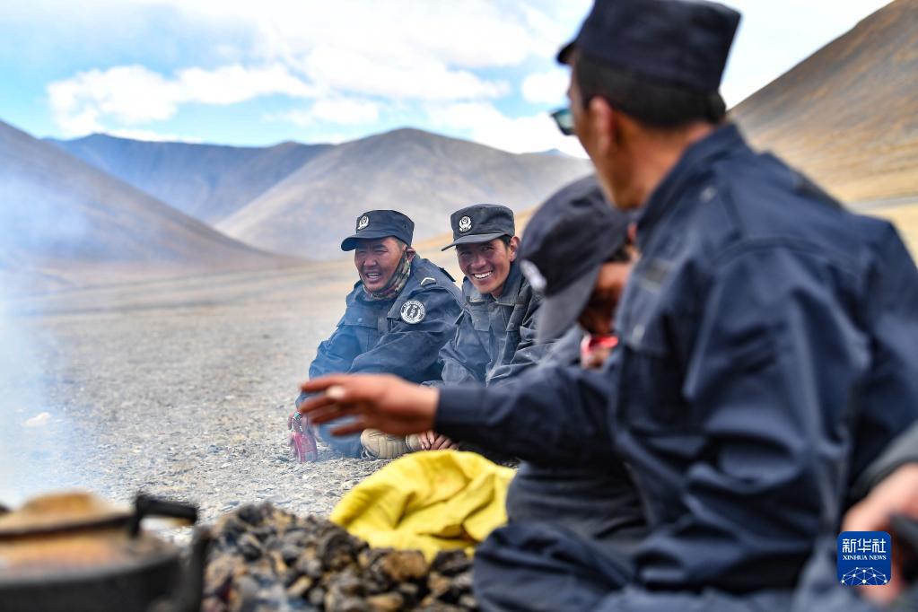 護(hù)邊聯(lián)防隊(duì)隊(duì)員在一塊空地上準(zhǔn)備午餐(6月2日攝)。新華社記者 晉美多吉 攝