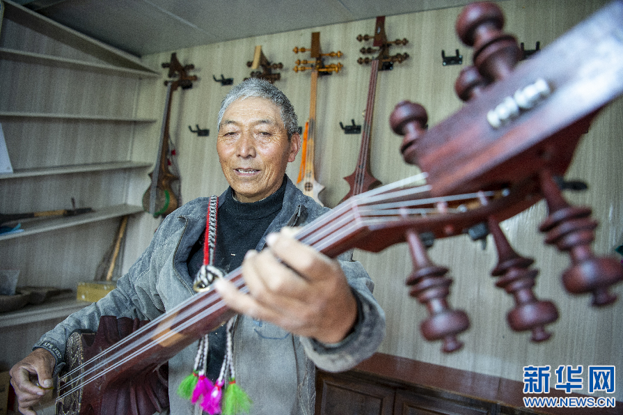 6月8日,娘嘎扎念琴制作技藝傳承人羅布次旦在彈奏扎念琴。新華網(wǎng) 旦增努布 攝