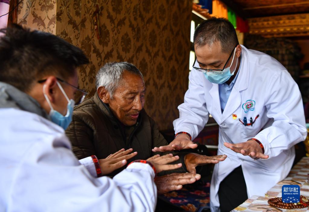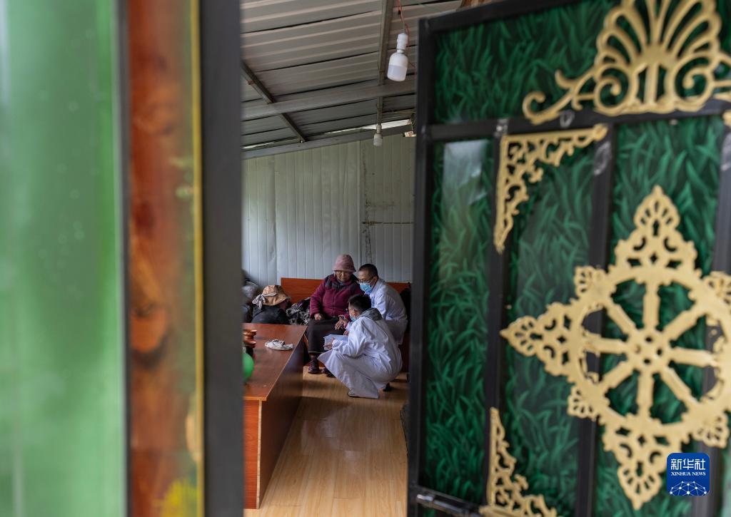 6月12日,王振疆(右一)和尼瑪益西(右下)在吞不絨村為阿珍診治。新華社記者 費茂華 攝