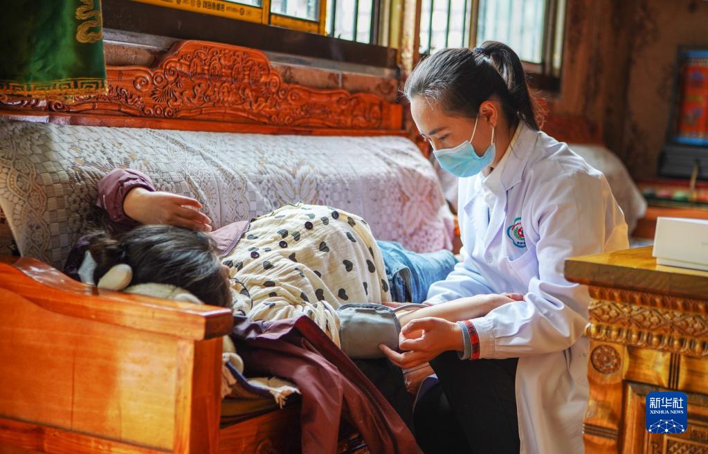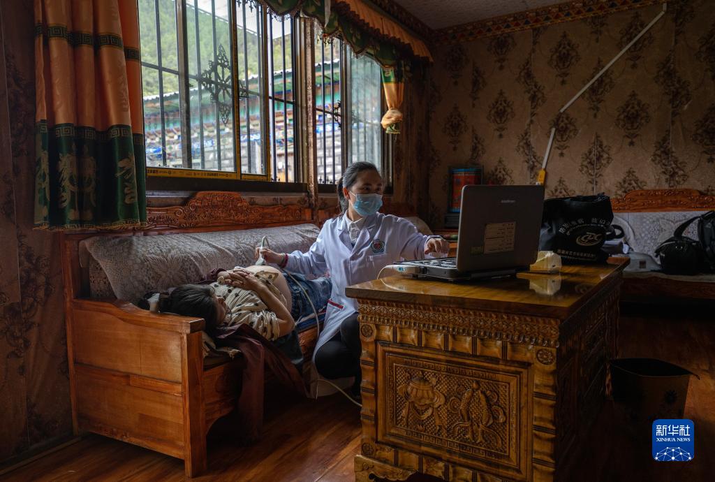 6月12日,王彤旭在吞不絨村為珠杰診治。新華社記者 費茂華 攝