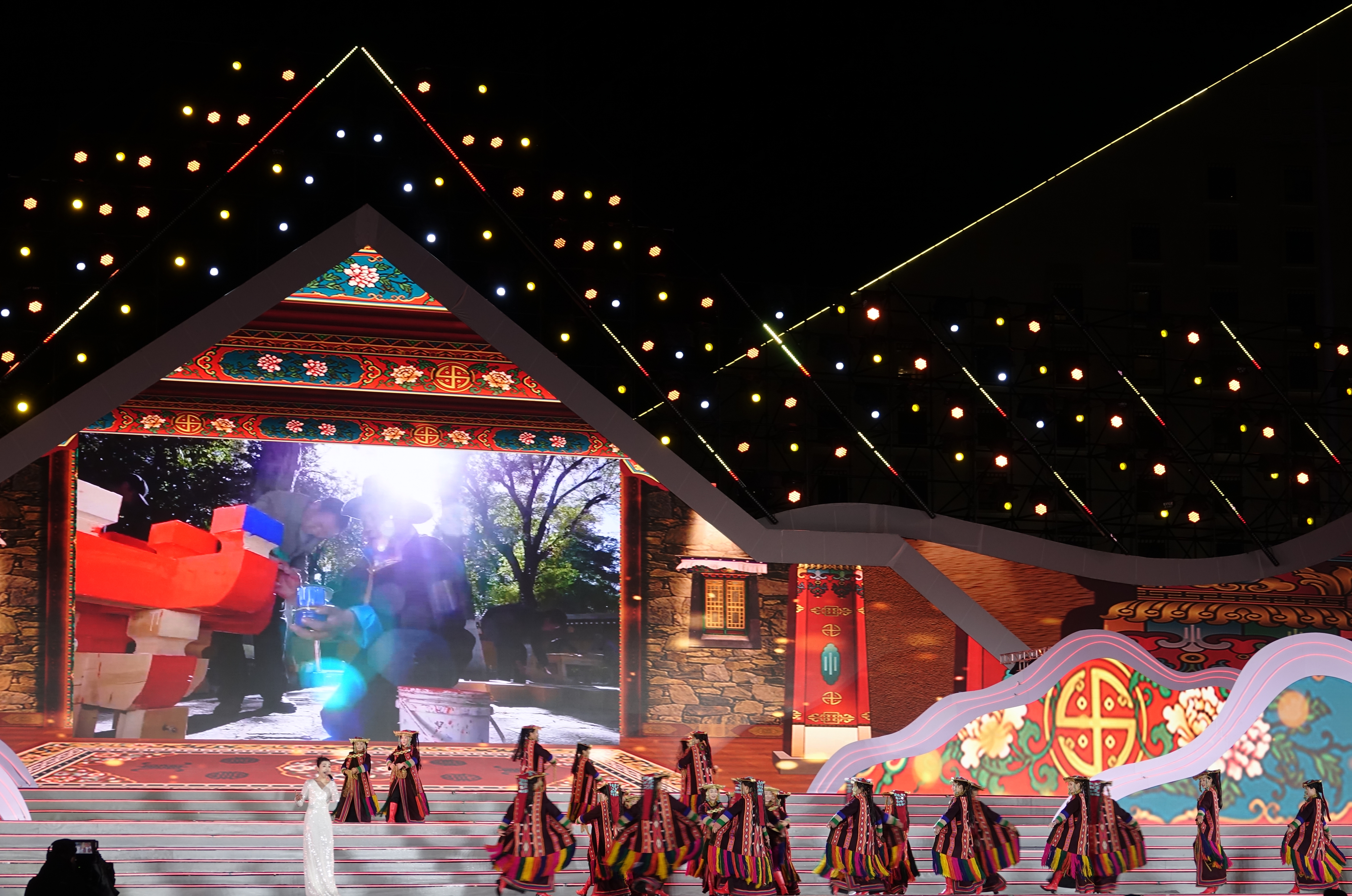 文藝演出《擁抱新西藏》在經(jīng)久不息的歡呼聲中開(kāi)場(chǎng)。京劇《四郎探母》、藏戲《扎西雪巴》、粵劇《文成公主》選段,三種戲曲藝術(shù)跨界融合表演,充分展現(xiàn)了中華優(yōu)秀傳統(tǒng)文化的魅力,在文化的交融中飽含各族兒女對(duì)祖國(guó)母親的熱愛(ài)和眷戀之情。情景歌舞《我來(lái)了,西藏》《金色家園》《呀啦嗦》《幸福踏歌》等精彩節(jié)目,生動(dòng)展現(xiàn)了新時(shí)代十年西藏各項(xiàng)事業(yè)取得的全方位進(jìn)步、歷史性成就;《牽夢(mèng)西藏》《心手相連》《云端上的納木措》《藍(lán)天下的祝?!贰稅傄麸w揚(yáng)》《飲酒歌》,充分展示了西藏自然風(fēng)光之美、歷史人文之美、民族風(fēng)情之美、包容開(kāi)放之美,再次向世界發(fā)出真誠(chéng)邀約,歡迎四面八方的朋友親近西藏、感悟西藏。