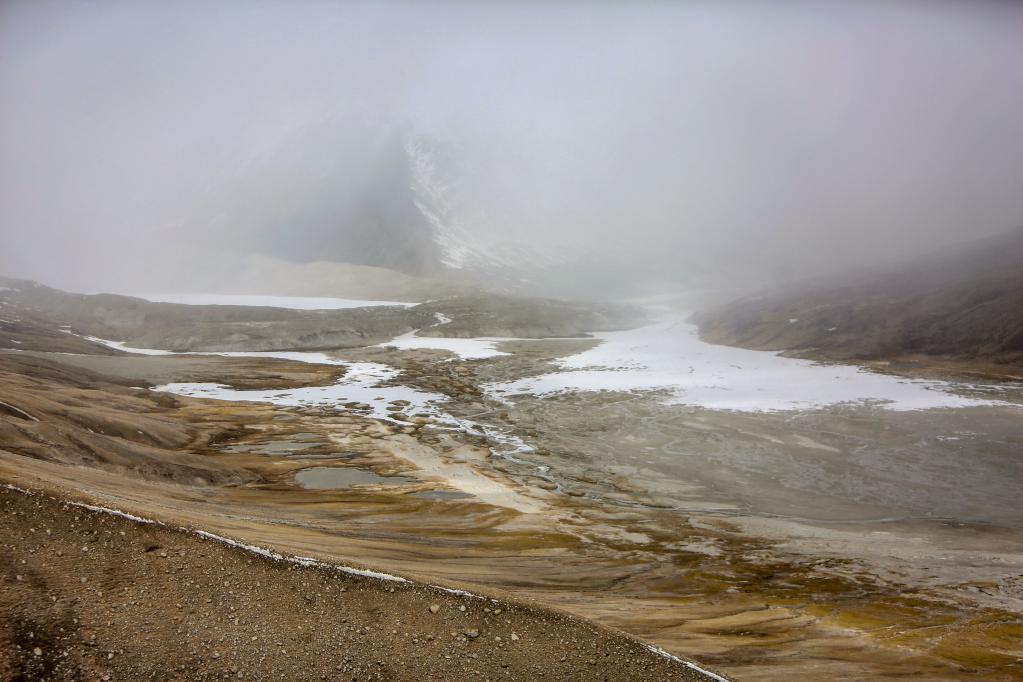 如果說札達(dá)土林和古格王國遺址給人的印象可以用宏偉壯觀來形容的話,那么雅魯藏布江發(fā)源地——杰瑪央宗冰川給人帶來的則是蕭瑟與遼闊的景象。我們趕到杰瑪央宗冰川的時(shí)候風(fēng)雪交加。凜冽的寒風(fēng)呼呼地刮在臉上像刀割一樣,風(fēng)吹得人幾乎睜不開眼睛。作為本次報(bào)道的視頻記者之一,我當(dāng)時(shí)最擔(dān)心的是機(jī)器拿不穩(wěn),拍攝畫面出現(xiàn)抖動的情況,所以拍攝全程我都把手中的相機(jī)攥得很緊。