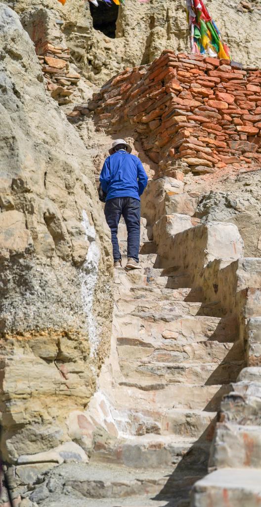 仁增旺扎老人的腿腳不便,每次從山腳登上石窟所在的山頂都需要耗費(fèi)巨大的氣力。皮央和東嘎石窟遺址群所在的小山相對高差大概有150米左右,一共有400多級臺階,每一級臺階都非常陡峭,走路一搖一晃的仁增旺扎老人每次都要花半個小時(shí)多才能從山腳登上山頂。