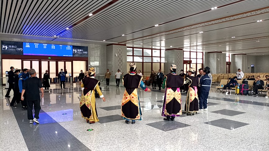 2023年6月25日,拉薩火車站、林芝火車站內(nèi)異常熱鬧。在拉薩火車站,準備乘坐C925次旅客列車前往林芝的旅客和車站“天路格?;ā狈?wù)隊的工作人員一起開展著競答互動小游戲,復(fù)興號列車紀念筆,車站卓瑪工作室卡通形象鑰匙扣、旅行雜志等小禮品受到旅客喜愛。在林芝火車站,工作人員和旅客跳起了熱情的鍋莊,他們用高原獨有的方式,慶祝拉林鐵路開通兩周年這個美好的日子。