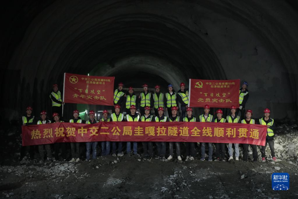 6月28日,施工人員在西藏S5線圭嘎拉隧道全線貫通后合影留念。新華社發(fā)(林夢月 攝)