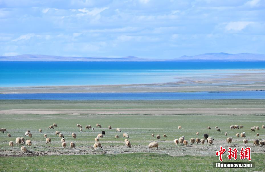 圖為藏北草原上的湖泊與羊群。貢嘎來(lái)松 攝