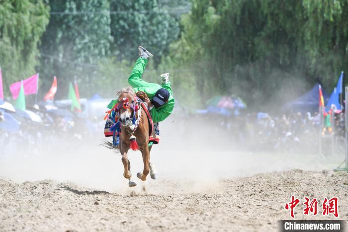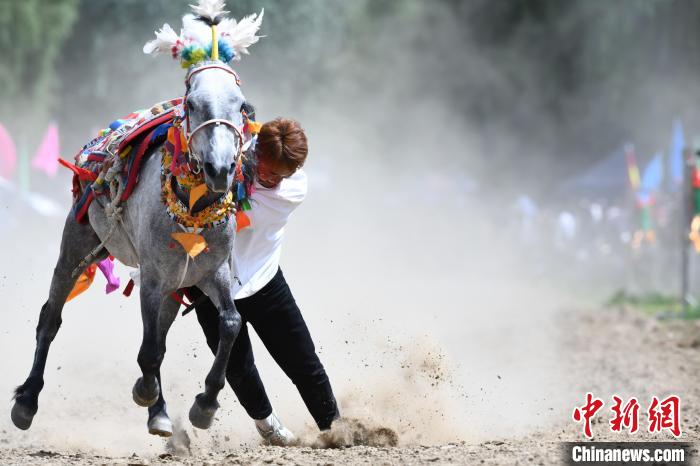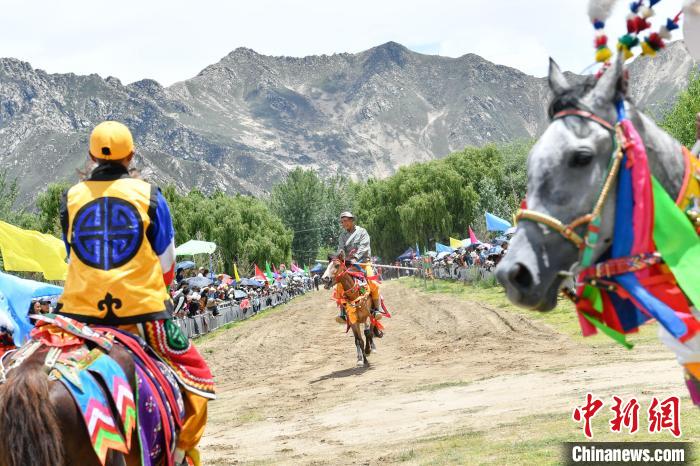 7月24日,在西藏自治區(qū)拉薩市曲水縣曲水鎮(zhèn)茶巴朗村村民身著節(jié)日盛裝進(jìn)行賽馬和馬術(shù)表演歡度“望果節(jié)”?!巴?jié)”已有1500多年的歷史,是國(guó)家級(jí)非物質(zhì)文化遺產(chǎn),流行于西藏拉薩、日喀則、山南等地。