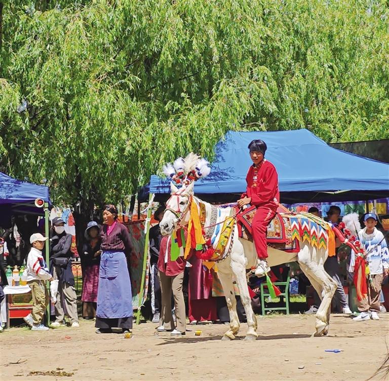 賽場(chǎng)上,幾個(gè)稚嫩的小伙子引起了大家的注意。他們熟練地跳上馬背、抓緊韁繩、目光堅(jiān)定?!巴?!太棒了!”“媽媽?zhuān)莻€(gè)哥哥拿到了哈達(dá)!”……只見(jiàn)16歲的單增阿旺策馬奔騰,俯身拾起地上的綠色哈達(dá),獲得大家的陣陣掌聲?!拔覐男【秃芟矚g騎馬,除了去年因?yàn)閷W(xué)業(yè)緊張,沒(méi)能參加賽馬表演,往常每年都會(huì)參加。”單增阿旺說(shuō)。