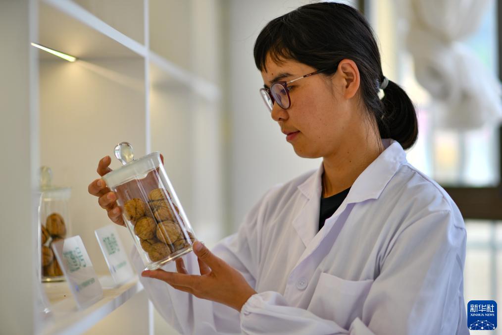 劉利平博士在高原核桃研究所檢查核桃果實(shí)標(biāo)本(7月27日攝)。新華社記者 旦增尼瑪曲珠 攝