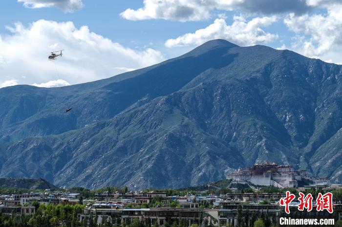 8月8日,空客H125直升機在拉薩上空演示吊裝應(yīng)急救援設(shè)備。中新社記者 江飛波 攝