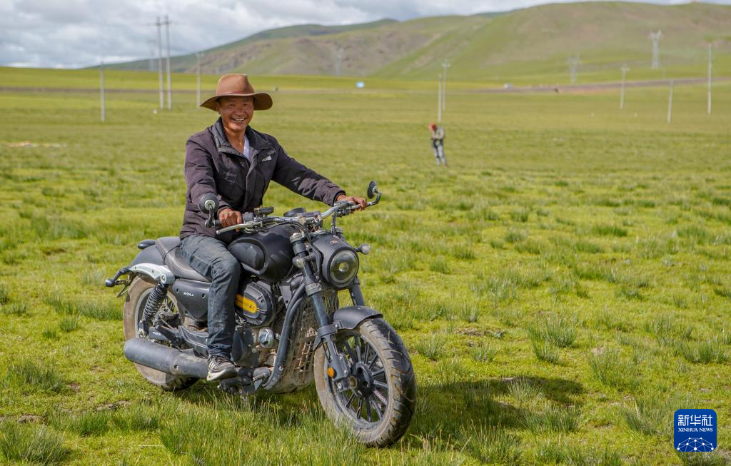 8月11日,次扎達(dá)在羌塘草原上騎摩托車(chē)出行。新華社記者 邵澤東 攝?