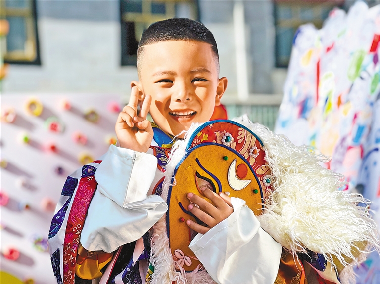 “非遺進(jìn)校園”活動中,小朋友戴上藏戲面具,感受非遺文化。記者 格桑倫珠 攝