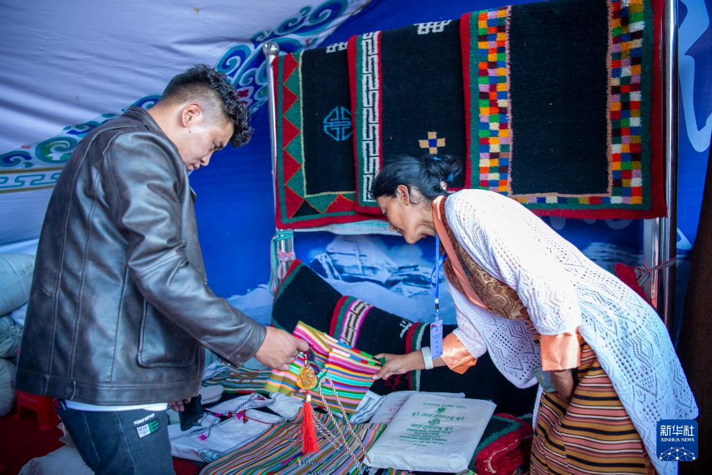 普蘭縣細德村的村民次仁卓瑪(右)在展銷會上向顧客介紹產(chǎn)品。