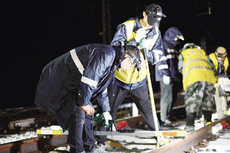 21時30分,作業(yè)中,暴雨傾盆而下,瞬間覆蓋了整個施工現(xiàn)場,噼里啪啦地打在現(xiàn)場作業(yè)人員身上。早已經(jīng)歷過無數(shù)次風(fēng)雨洗禮的他們,握緊手中的工具,按照分工忙碌起來,有的測量數(shù)據(jù)、有的配合作業(yè)、有的檢查設(shè)備、有的盯控安全……整個作業(yè)現(xiàn)場忙而有序,這場突降的暴風(fēng)雨,儼然已成為促使他們奮進的鼓點,他們正用昂揚的斗志,奏響高原鐵路人的“天路夜曲”。