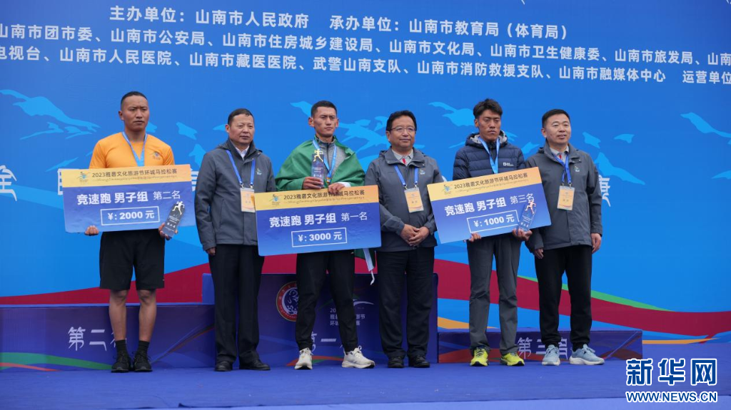 圖為2023雅礱文化旅游節(jié)環(huán)城馬拉松賽競速跑男子組頒獎(jiǎng)典禮(8月26日攝)。新華網(wǎng) 柑丹鴦琦 攝