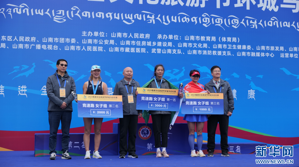 圖為2023雅礱文化旅游節(jié)環(huán)城馬拉松賽競速跑女子組頒獎(jiǎng)典禮(8月26日攝)。新華網(wǎng) 柑丹鴦琦 攝