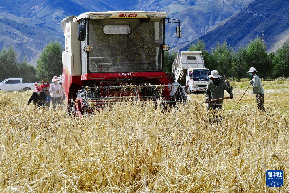 近日,西藏拉薩市曲水縣青稞成熟,人們忙著收割青稞,感受豐收的喜悅。