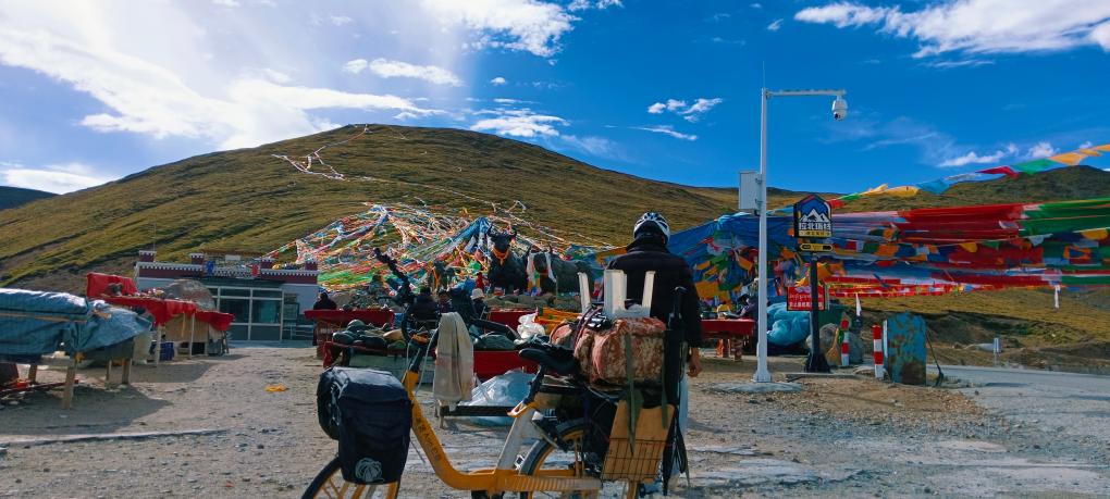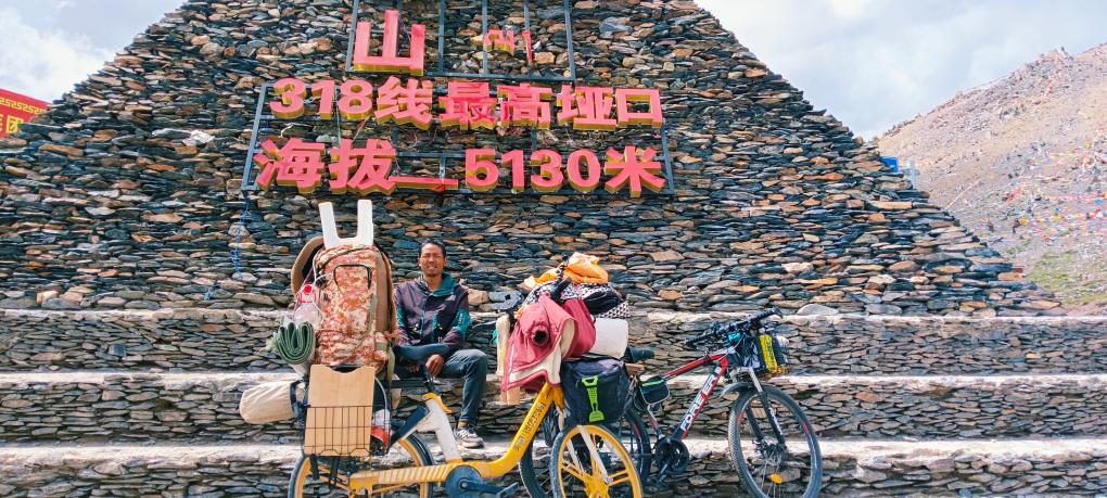 王賢日騎車跨過(guò)位于西藏左貢縣境內(nèi)的東達(dá)山埡口