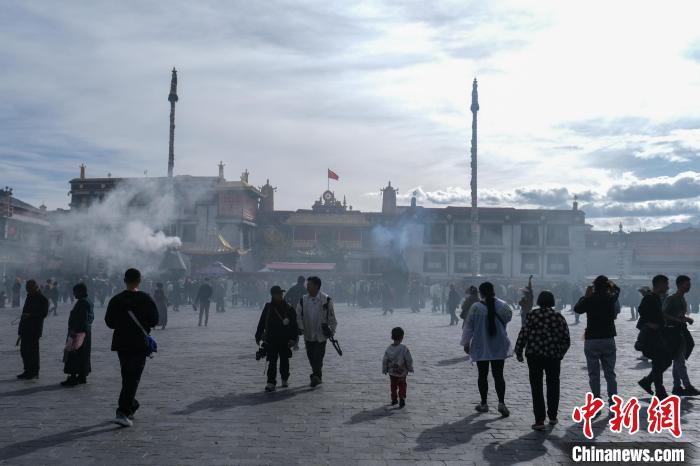 圖為9月30日上午,游客、市民在大昭寺廣場。當(dāng)日恰逢轉(zhuǎn)經(jīng)日,大昭寺、八廓街桑煙氤氳,熱鬧非常。江飛波 攝
