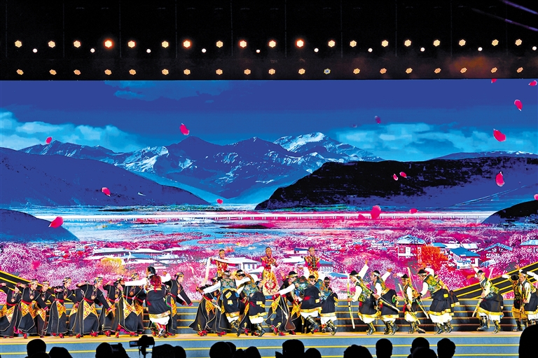 西藏自治區(qū)歌舞團(tuán)、林芝市民族藝術(shù)團(tuán)表演的開(kāi)場(chǎng)歌舞《扎西德勒》。記者 洛桑 攝