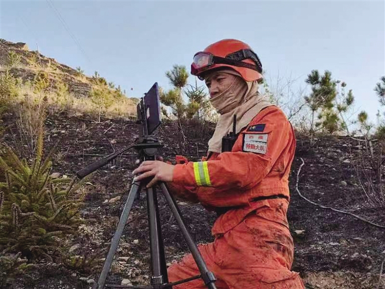 通信員在火場架設(shè)機位。