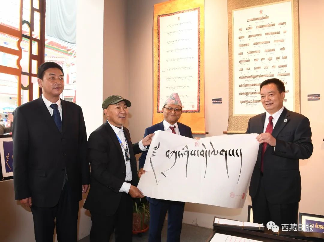 這是中國西藏旅游文化國際博覽會(huì)期間,王君正向尼泊爾聯(lián)邦院主席加內(nèi)什·普拉薩德·蒂米爾西納贈(zèng)送藏文書法作品。記者 李洲 攝