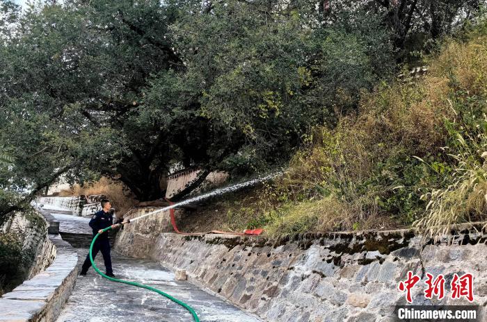 冬季來臨天氣干燥,為杜絕墻體粉刷過程中因意外引燃山體雜草,造成不可挽回的損失,在墻體粉刷正式開始前一周,大隊(duì)每日清晨、傍晚組織指戰(zhàn)員對(duì)布達(dá)拉宮山體進(jìn)行全面濕化,消除火災(zāi)隱患,濕化累計(jì)用水200余噸。