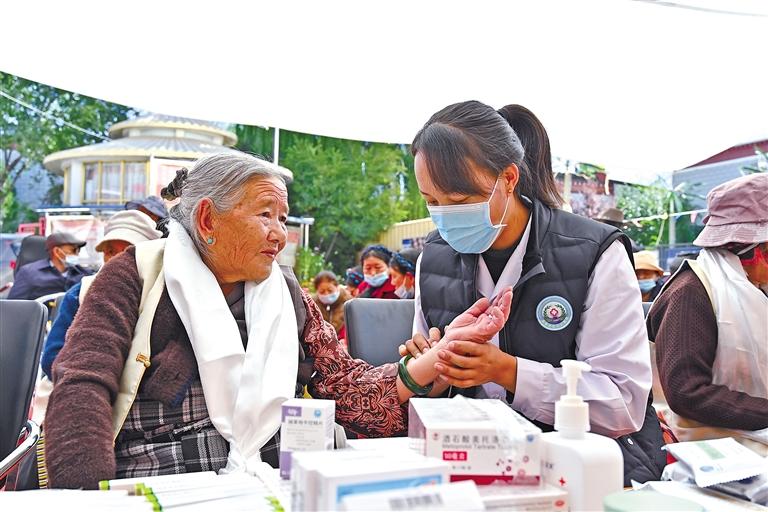 圖②:桑珠孜區(qū)志愿者為老年人免費(fèi)義診。 記者 扎西頓珠 攝
