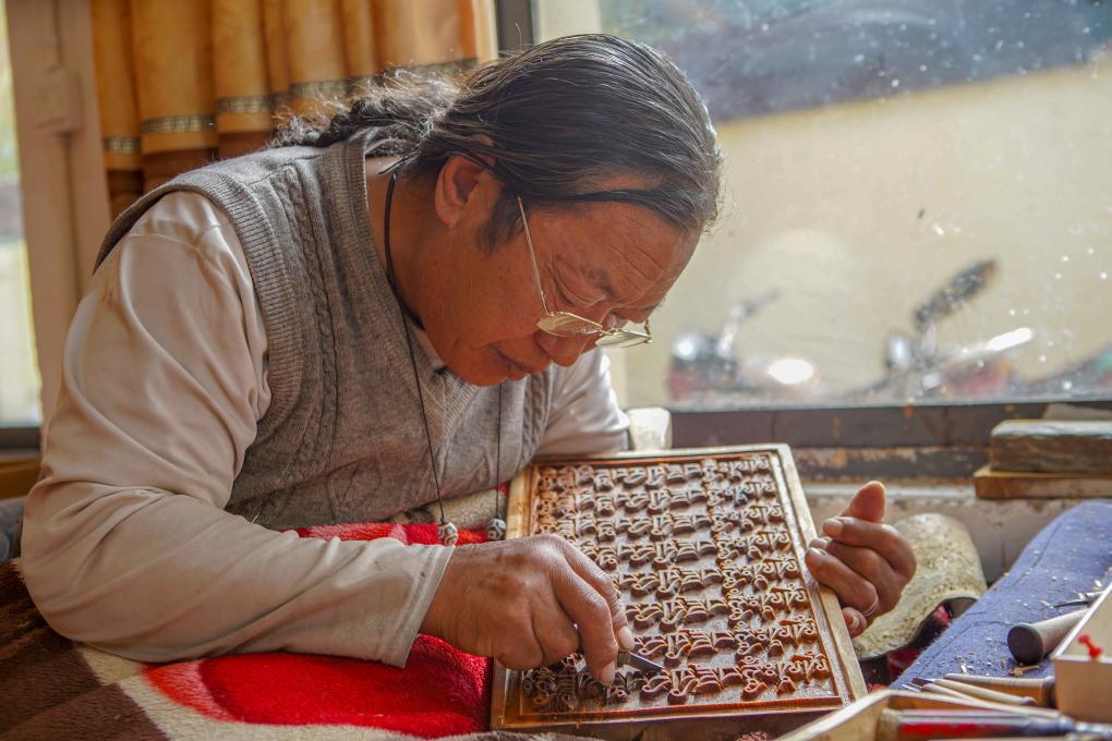 一手緊握刻刀,一手托住木板,刀起刀落間,木屑剝落,一件件樣式精美、色澤瑩潤的雕刻成品躍然眼前。在西藏昌都市江達縣波羅鄉(xiāng)外沖村,“波羅古澤刻版制作技藝”國家級傳承人澤培正在認真指導學徒制作木刻。
