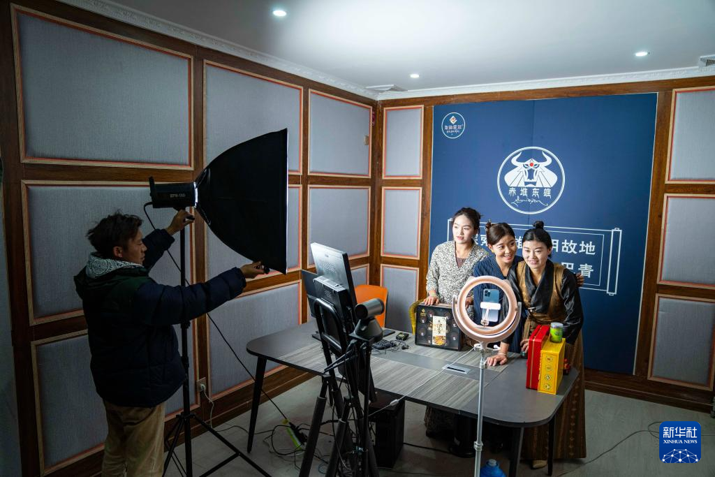 網(wǎng)絡主播在巴青縣“赤堆東雄”網(wǎng)紅直播間推介當?shù)靥厣r牧產(chǎn)品(10月29日攝)。新華社記者 孫非 攝
