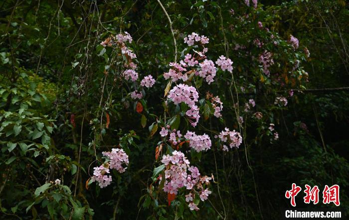 因氣候濕潤(rùn),森林里的樹(shù)上長(zhǎng)滿了藤蔓植物、蕨類(lèi)植物、苔蘚。在這里,植物從空間上獲得了最大密度的生長(zhǎng)。開(kāi)滿粉色花朵的植物從樹(shù)上倒掛而下,科考人員一眼辨認(rèn)出是大花水東哥,奈何正是花期無(wú)法采集種子。
